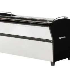 Automatic espresso coffee machine with 2 groups, electronic switchboard to control the coffee dosages volumetrically and manual overide group switch per group. Automatic water filling and copper boiler with 11,5 litres capacity with heat exchanger per group. Two steam taps (stainless steel) and one hot water tap.